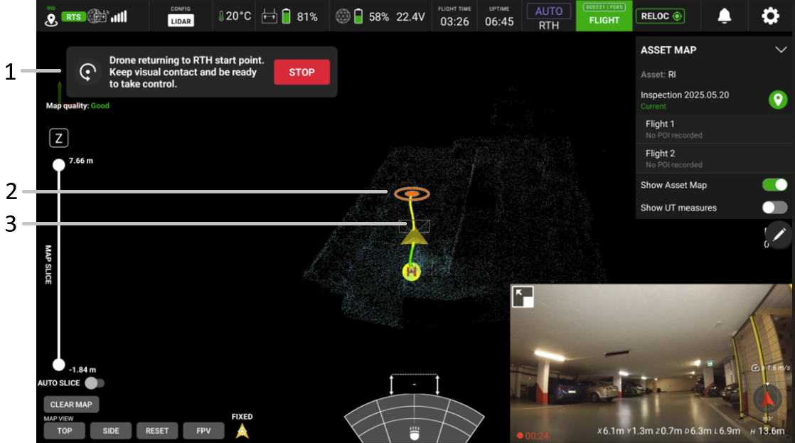 Smart RTH has additional elements available in Cockpit enabling its function. Refer to the screenshot and numbered descriptions: