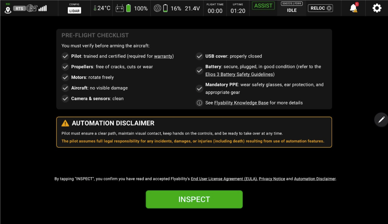The EULA, Privacy Notice, Automation Disclaimer are presented on the PRE-FLIGHT CHECKLIST, before taking-off and starting the inspection. The Automation Disclaimer is also present in the Settings menu.