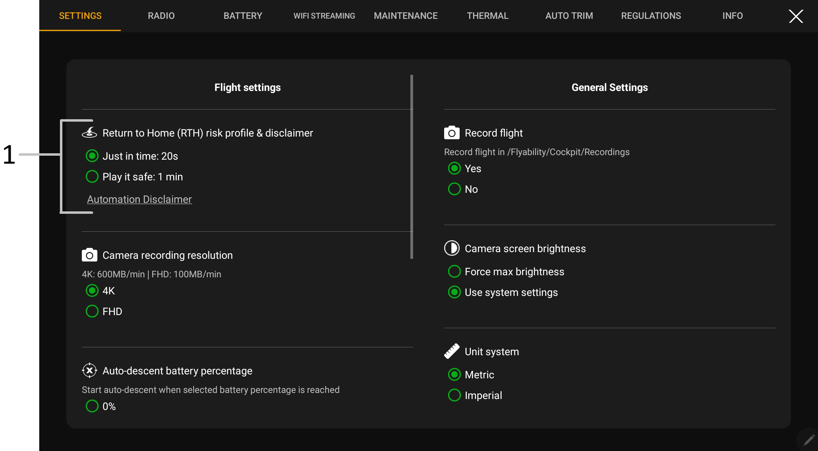 Select the amount of buffer for calculating the Smart RTH suggested time. This feature is accessible in the General Settings menu: